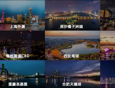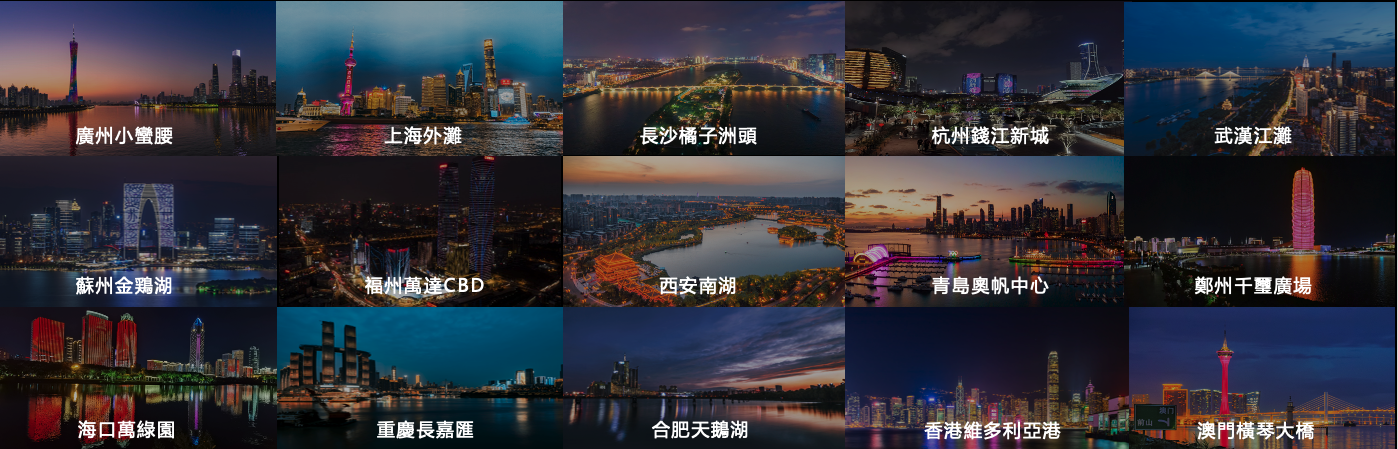 广州小蛮腰、上海外滩、长沙橘子洲头、杭州钱江新城、武汉江滩、苏州金鸡湖、贵阳未来方舟、青岛奥帆中心、西安南湖、郑州千玺广场、海口万绿园、重庆长嘉汇、合肥天鹅湖、香港维多利亚港、澳门横琴大桥、深圳世界之窗、厦门白鹭洲、福州万达滨江等核心地标飞行权。